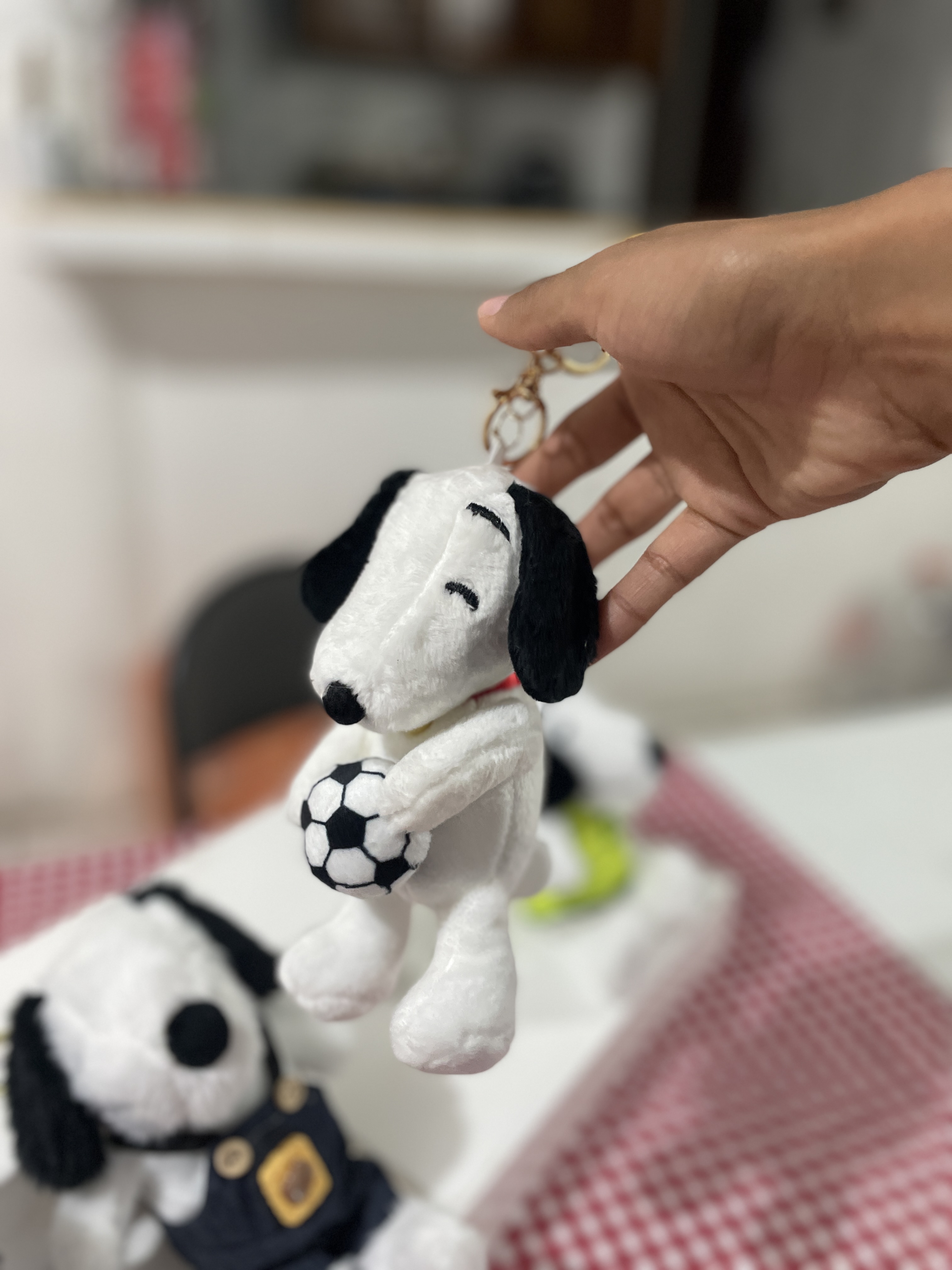 Llaveritos súper afelpaditos de peluche snoopy con cadena reforzada para que no se caigan vestidos de granjero o de futbol