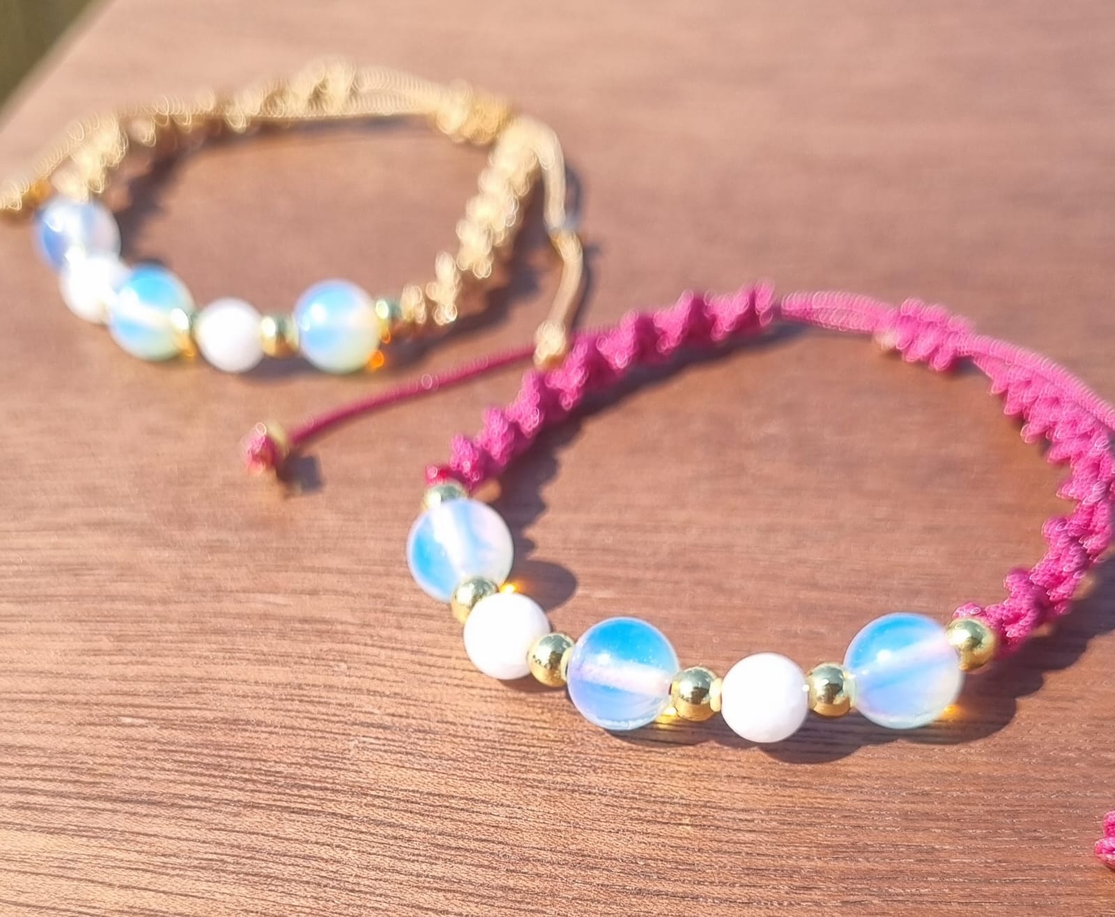La piedra luna es símbolo de intuición, equilibrio emocional y renovación, asociada a la energía femenina y a los ciclos de la luna. Su tejido en macramé aporta un estilo artesanal, cómodo y ajustable, perfecto para usar todos los días o regalar con intención.