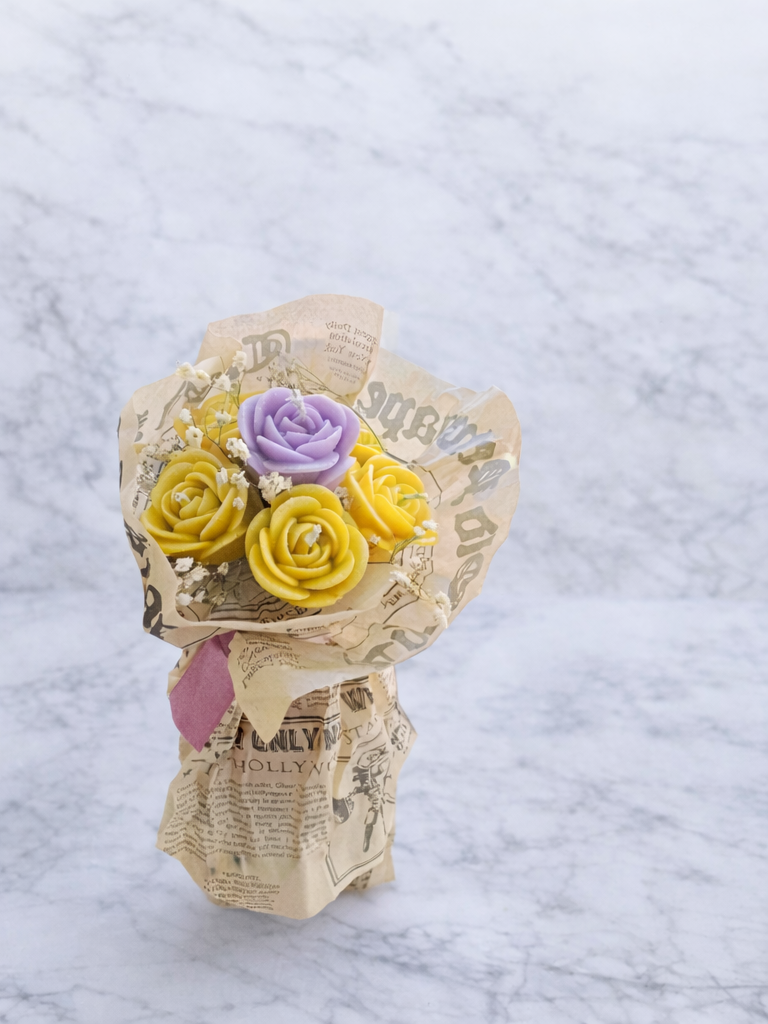 Ramo de 6 pzas de velas en forma de rosa, incluye papel tipo periódico y listón aroma dependiendo de la disponibilidad
